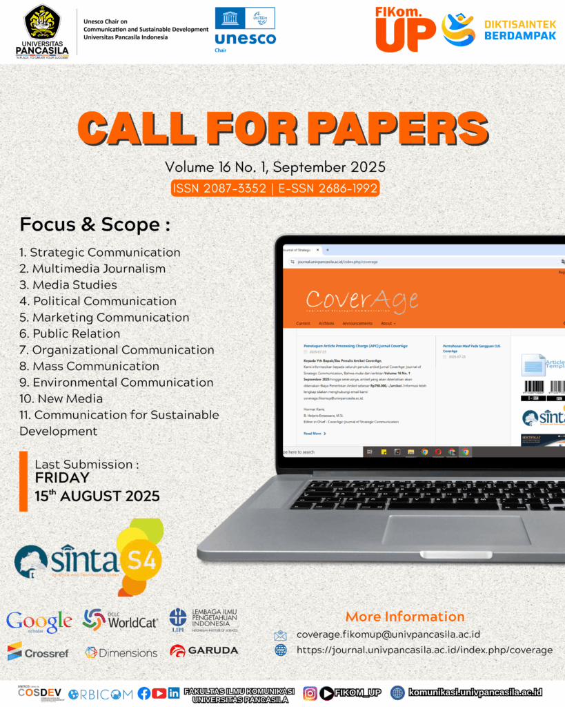 CALL FOR PAPERS CoverAge (Journal of Strategic Communication) VOLUME 16 NO. 1, September 2025 CoverAge Journal is a scientific journal published by the Faculty of Communication Sciences, Pancasila University, Jakarta, published every March and September. CoverAge contains articles from research and knowledge-based literature reviews in the fields of strategic communication, multimedia journalism, and media studies. Articles come from authors who […]