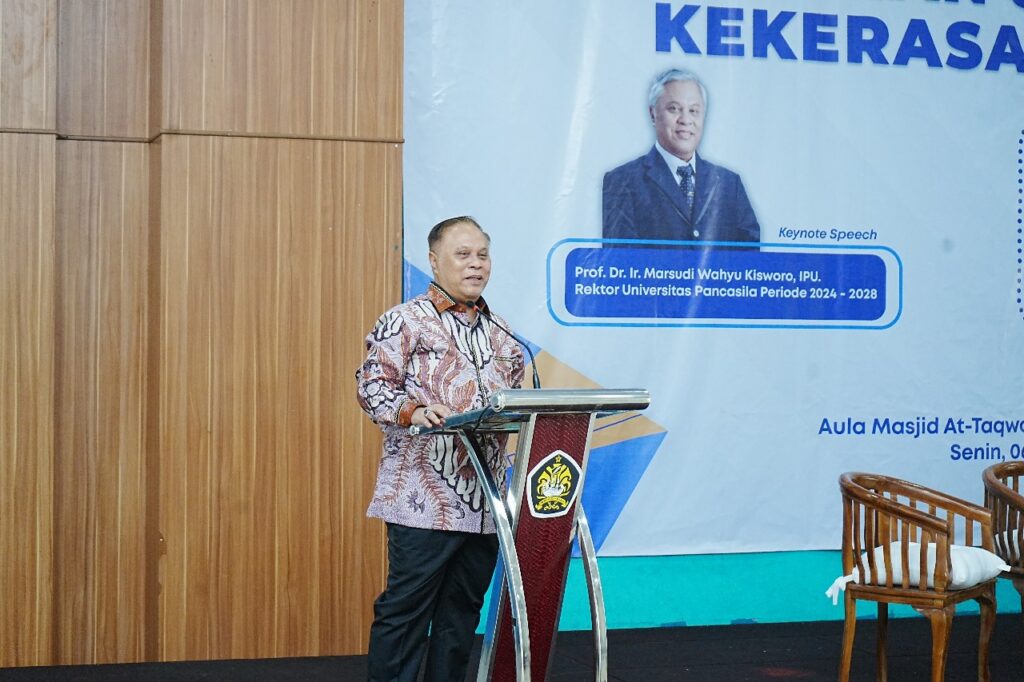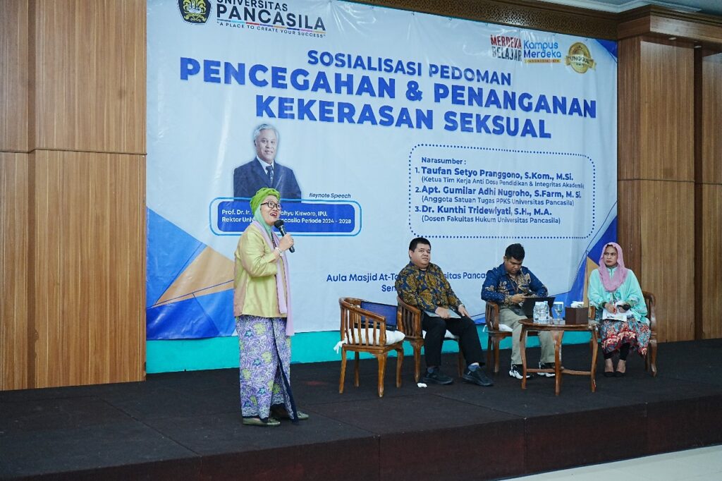 Present at this activity was the Chancellor of UP, Prof. Dr. Ir. Marsudi Wahyu Kisworo, IPU who also gave a speech. Vice Chancellors and Faculty Officials. This activity invited 3 (three) resource persons from the Ministry of Education, Culture, Research and Technology, the Pancasila University PPKS Task Force, namely Taufan Setyo Pranggono, S.Kom., M.Sc. (Chair of the Anti-Sin Education and Academic Integrity Working Team), apt. Gumilar Adhi Nugroho, S.Farm, M.Si. (Member of the Pancasila University PPKS Task Force) and Dr. Kunthi Tridewiyati, SH, MA (Lecturer at the Faculty of Law, Pancasila University).